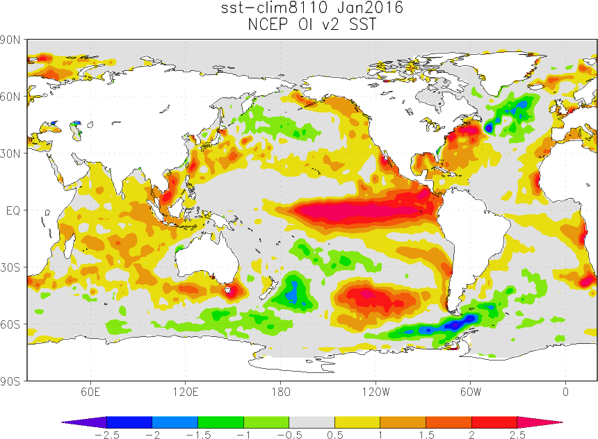The following is a Global map of Reynolds OI.v2 Sea Surface Temperature (SST) anomalies for January 2016. It was downloaded from the KNMI Climate Explorer. The contour range was set to -2.5 to +2.5 deg C and the anomalies are referenced to the WMO-preferred period of 1981-2010.